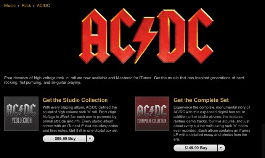 AC/DCЕще утром на iTunes Store появилась реклама полного каталога легендарных AC/DC. Среди доступных предложений есть полная студийная коллекция за $99.99 и расширенная коллекция с редкими записями, демо треками и всеми альбомами в живом исполнении за $149.99.
