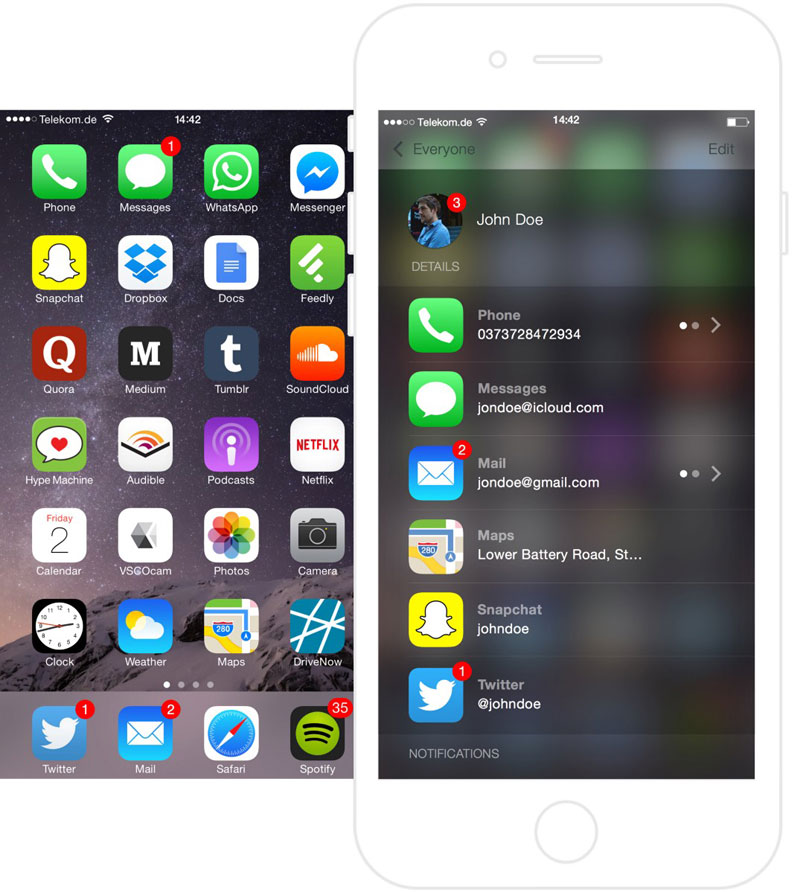 Дизайнер предлагает объединить в адресной книге различные способы связи с людьми. Кроме телефонного номера в карточке абонента отображается его акк в iMessage, местоположение на карте, акки в Snapchat, Facebook, WhatsApp, Twitter, мейлы.