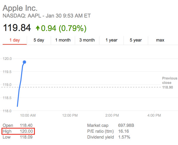 Стоимость акций Apple на торгах в пятницу достигла рекордной отметки в $120, поднявшись за день на 0,8%. Это абсолютный рекорд.