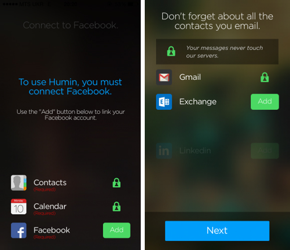 Humin можно синхронизировать с Gmail, Facebook, LinkedIn и Exchange. Подключаться ко всем сервисам не обязательно, можете выбрать те, которыми пользуетесь.
