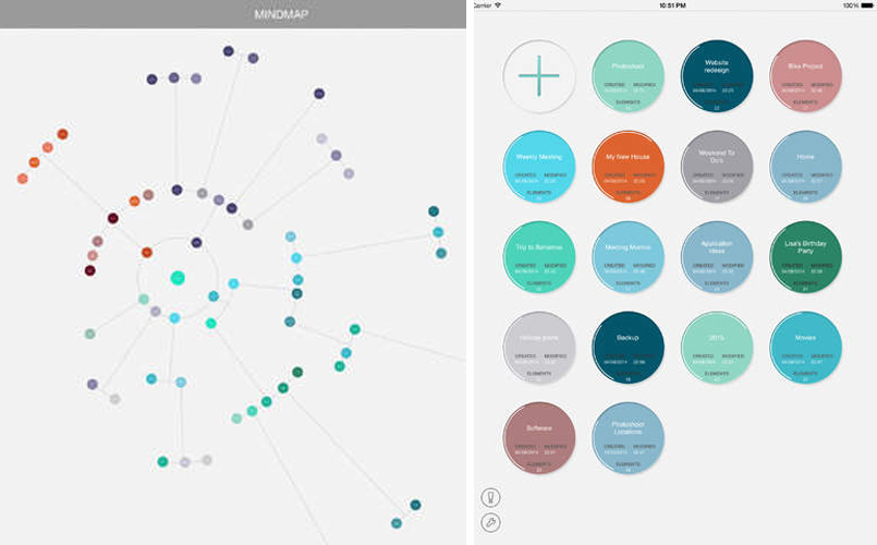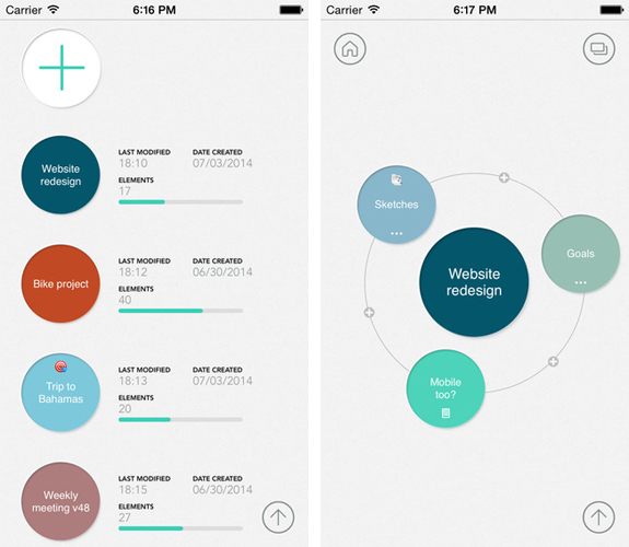Главный элемент, вокруг которого строиться ваша информация, находится в центре. Вокруг него крутятся меньшие элементы, каждый из которых может иметь связи с еще мене важными элементами. Каждый элемент схемы можно изменить – иконка, цвет и т.д. Главные преимущества приложения – простой принцип работы и хорошая анимация.