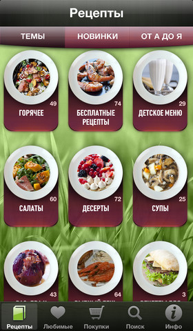 Новые рецепты появляются в приложении каждую неделю. Для удобного поиска выделены несколько основных тем, которые постоянно меняются и дополняются (например «Меню для любимого мужчины», «Пасха», «Летнее меню» и т. д.).