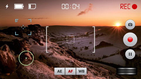 Установив и запустив приложение, вы увидите горизонтально закрепленный интерфейс с кнопкой записи, настройками и фотосъемкой, расположенными справа. Один тап по любой точке кадра позволяет настроить экспозицию и автофокус, двойной тап – сбрасывает эти параметры.