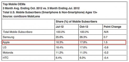 Согласно информации, предоставленной сервисом comScore MobiLens, Apple поднялась с третей позиции на вторую в конце июля, заполучив 17,8% рынка США, в то время как у осталось LG 17,6%.