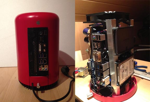 Естественно, компьютер получился не таким же мощным и производительным, как оригинальный Mac Pro 2013. Устройство получило процессор Intel Core i3, материнскую плату Gigabyte z87n, Radeon 7750, HDD и SSD. Габариты компьютера – 18 см в ширину и 26 в высоту. Зато корпус устройства обошелся оригиналу всего в 60 евро.