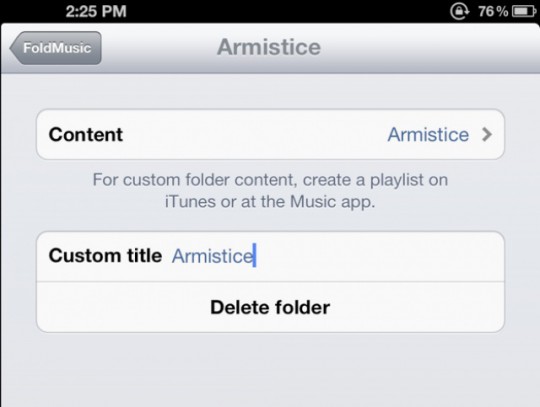 После установки FoldMusic за $1.50, этот твик добавится в Настройки. После этого можно добавить плейлист или альбом в Настройки, и у каждого плейлиста будет своя папка. Зайдите в папку, чтобы увидеть все треки и прослушать музыку.