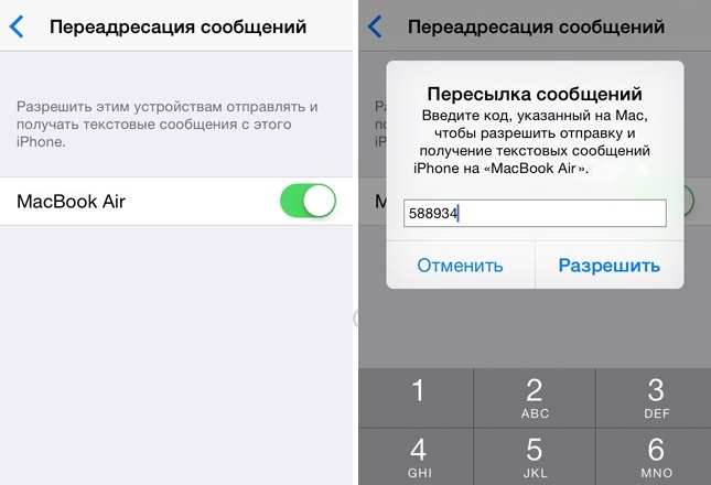 Для завершения настройки опции вам нужно будет ввести 6-значный код подтверждения, который генерируется программой Сообщения на Mac. Активировав переадресацию сообщений, смартфон сможет принимать и отправлять месседжи с выбранного Mac.