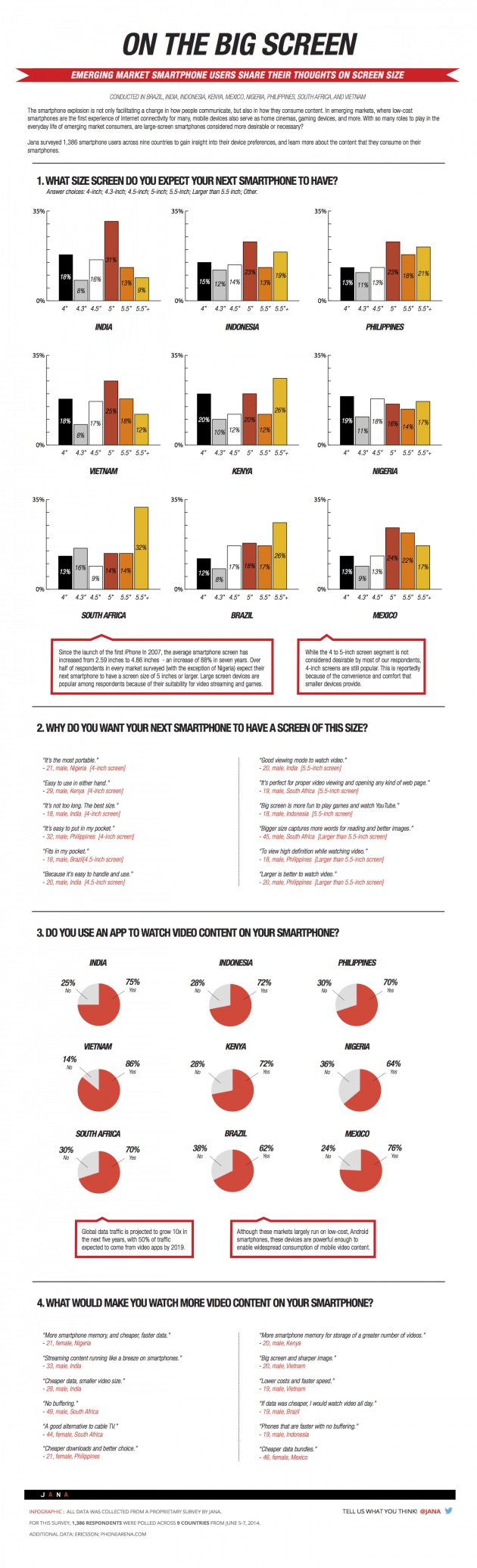 Компания Jana провела исследование-опрос 1366 жителей пользователей смартфонов из Индии, Индонезии, Филиппин, Вьетнама, Кении, Нигерии, Южной Африки, Бразилии и Мексики. Как оказалось, пользователи развивающихся стран предпочитают 5-дюймовые дисплеи.
