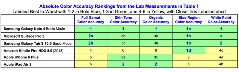 Samsung Galaxy Note 4 вырвал лидерство во всех категориях в тесте на абсолютную точность цветопередачи. Microsoft Surface Pro 3 и Samsung Galaxy Tab S 10.5 расположились на третьей ступени.