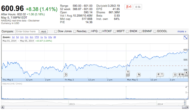 По слухам, в этом году нас ждет дебют iWatch, двух флагманских моделей iPhone 6, нового поколения приставки Apple TV, а также OS X 10.10 с новым интерфейсом и iOS 8 с фитнес-приложением. Анонсы всех новых продуктов укрепляют позиции Apple на рынке. Так, акции компании впервые с 2012 года превысили отметку в $600.