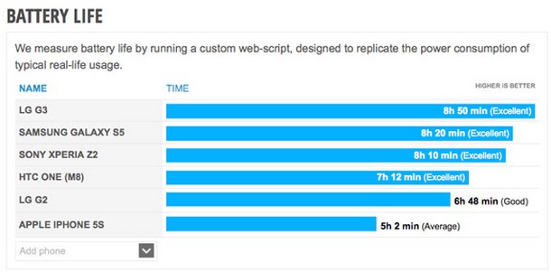 В тесте участвовали Apple iPhone 5s, Samsung Galaxy S5, Sony Xperia Z2, LG G3 и HTC One M8. Время автономной работы вычисляли при помощи специального скрипта, имитирующего действия пользователя. Это снижает погрешность исследования.