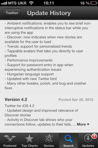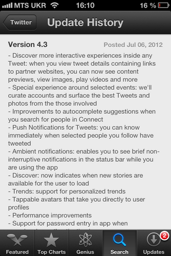 В Сети появилась информация, что официальный твиттер-клиент для iPhone очень скоро ждут масштабные изменения. Если войти в App Store под iOS 6 beta, то можно обнаружить релиз на еще не вышедший Twitter 4.3, в котором сообщаются такие новые возможности: