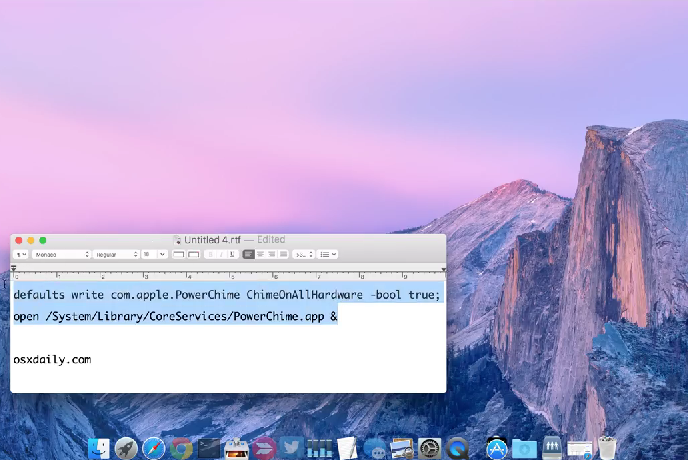 defaults write com.apple.PowerChime ChimeOnAllHardware -bool true; open /System/Library/CoreServices/PowerChime.app &